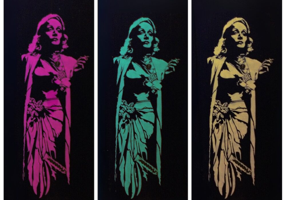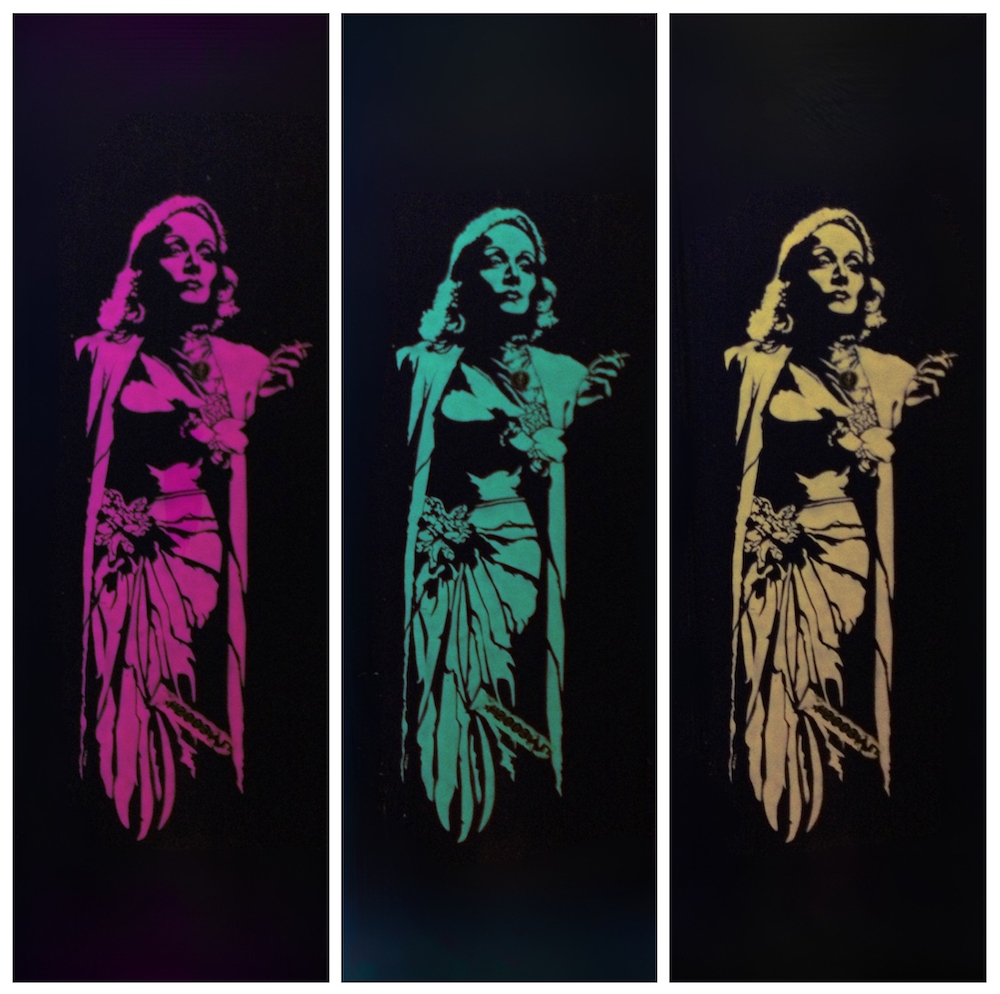 In the early 1990s, I painted Marlene Dietrich (commissioned) on the entrance of Café Salon De Blauwe Engel in Groningen, The Netherlands. Twenty years after I painted her, she was still there, on the door, in all her glory. Now, the door is gone. Her image is captured. I fused the photo of the original door into a digital version, to keep my original painting alive. A call to honor bravery and never give up your own courage.