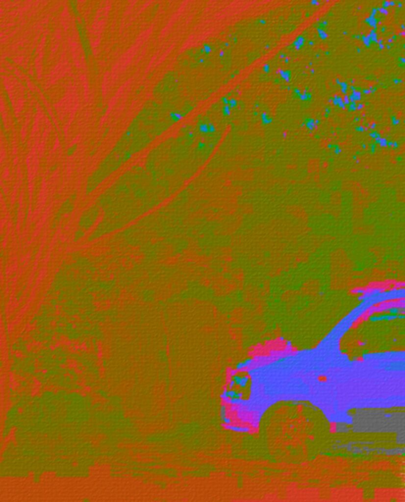In addition, there is the grandeur of nature. In which I would like to travel. The distorted color palette shows the contrast between nature and the vehicle, in which the need for mobility and independence can conflict with the vulnerability of the natural world.
