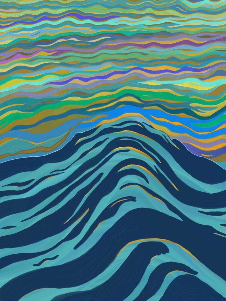 Yet, through it all, the world continues on—represented by the smaller, constant waves, always moving, indifferent to our personal highs and lows. The rhythmic flow of the waves mirrors life’s patterns. The vibrant colors I painted reflect the multifaceted nature of these moments, where joy, sorrow, and everything in between coexist.